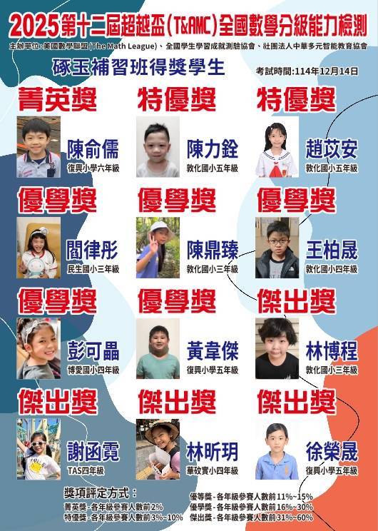 狂賀!本校學生參加2025第十二屆超越盃(T&AMC)全國數學分級能力檢測成績優異 !!!